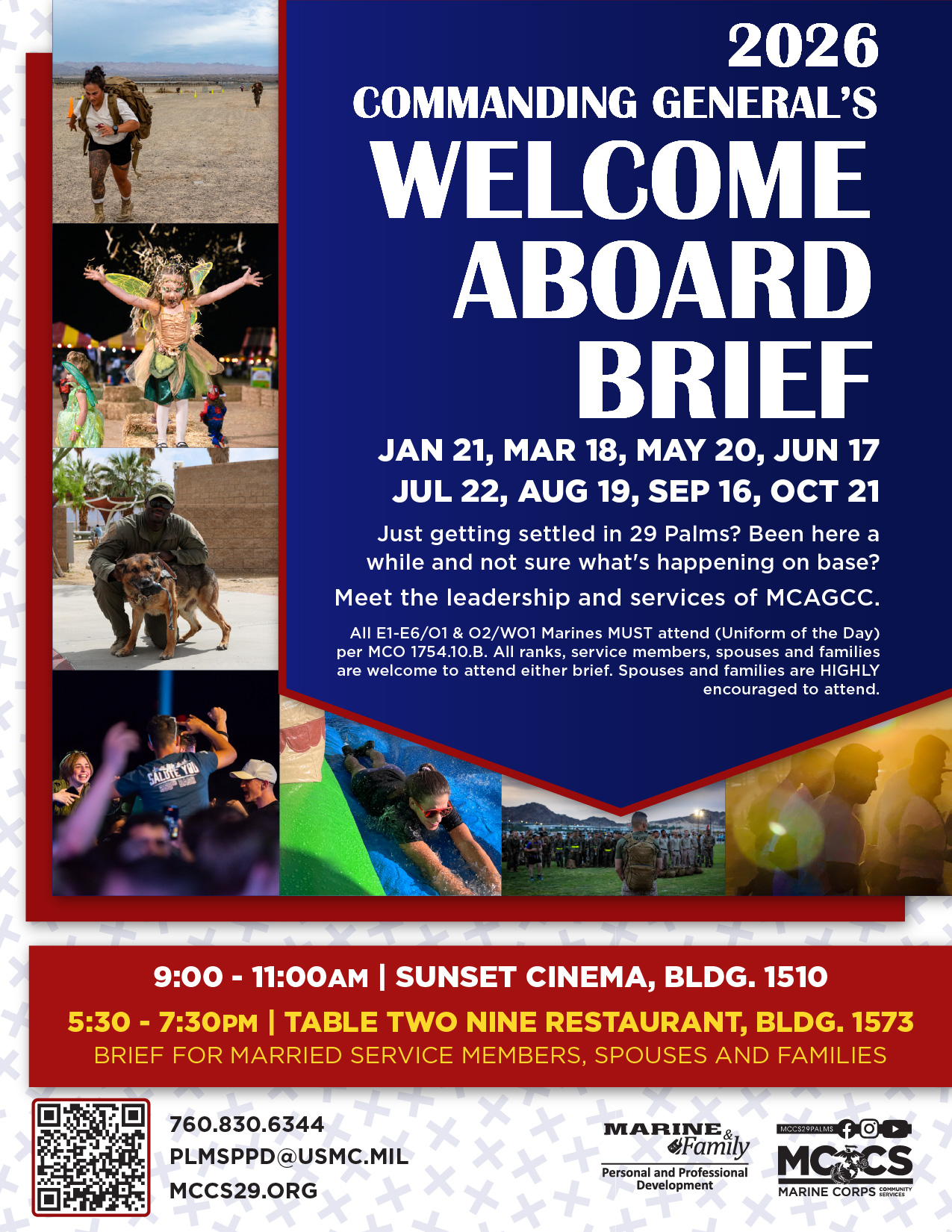 Phone: (760) 830-6344Just getting settled in 29 Palms? Been here a while and not sure what's happening on base?