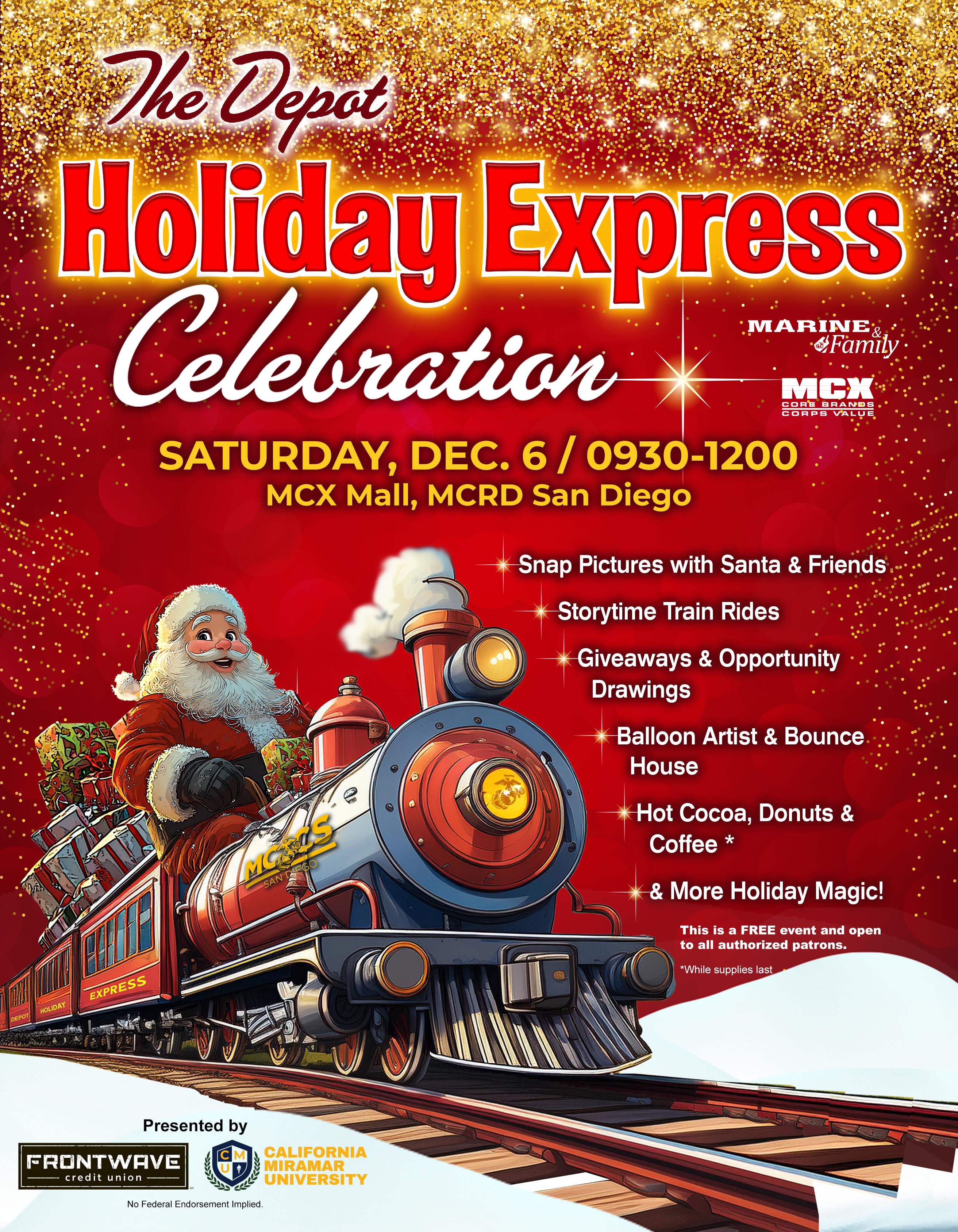 All aboard! Join us for the Depot Holiday Express Celebration on Saturday, December 6th from 0930-1200 at the MCX Mall. Take a ride on the storytime train, snap your own photos with Santa and friends, enjoy our amazing balloon artist, create holiday crafts and make memories! We will have donuts and hot chocolate or coffee!